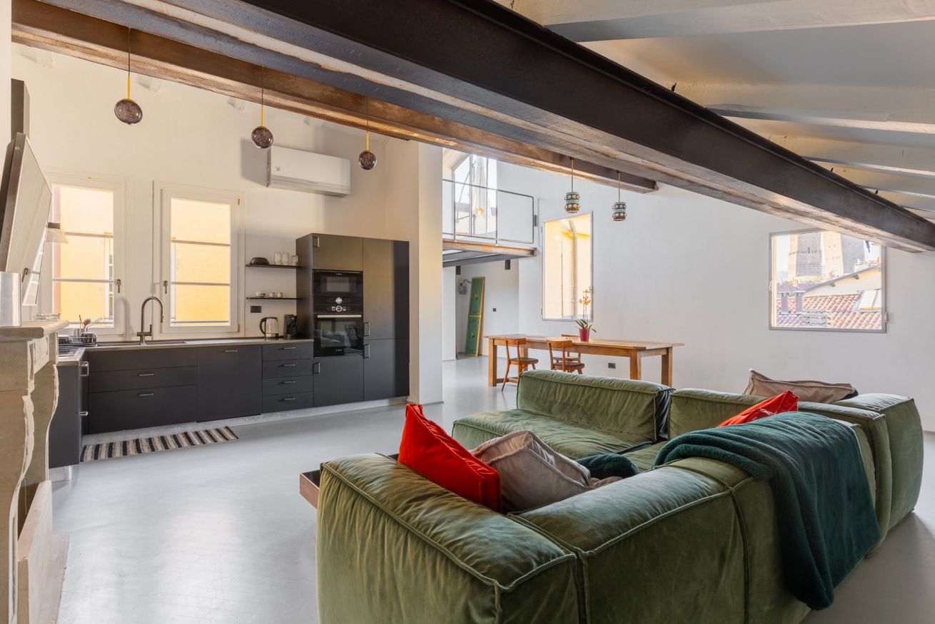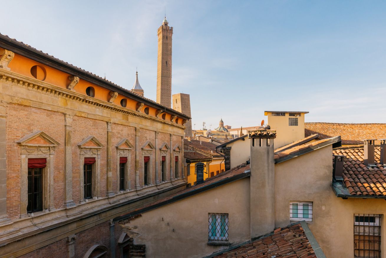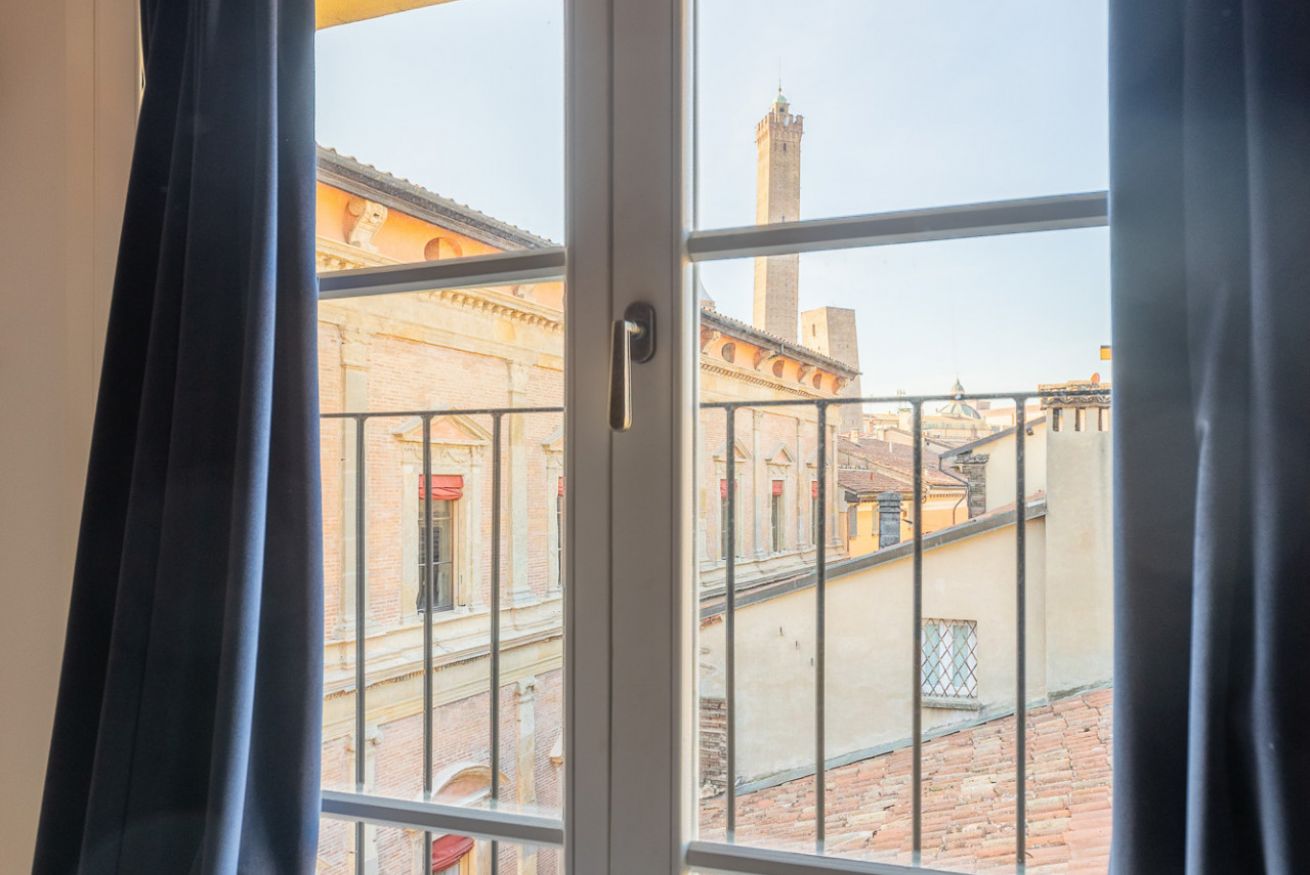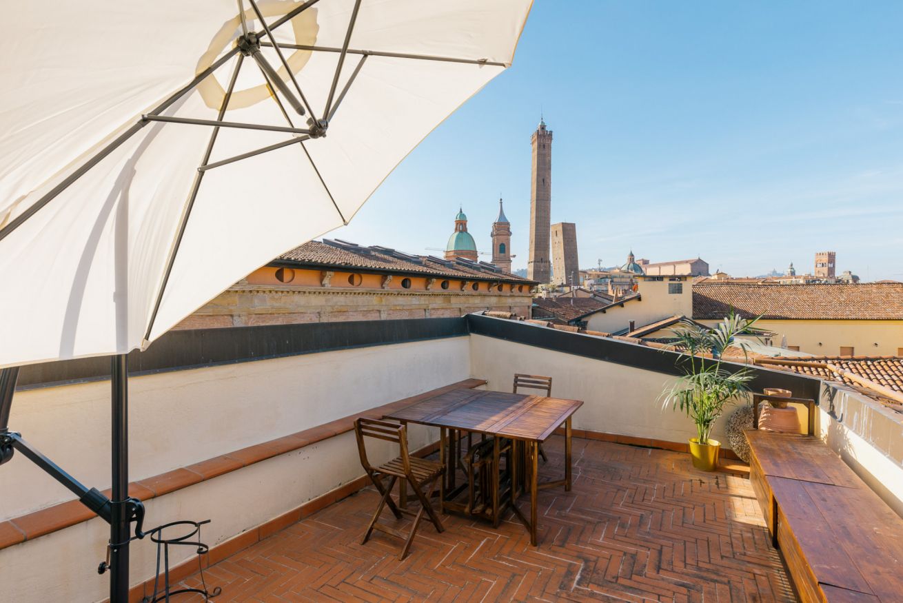 Appartamento di Design all'interno di una palazzo del 1300, posto al quarto piano senza ascensore con spettacolare terrazza con vista su tutta Bologna. A due minuti a piedi dalle due torri e nel cuore della zona universitaria. Si sviluppa su due livelli, entrata su soggiorno e cucina a vista, due camere da letto matrimoniali, camera con letto singolo e due bagni. Una scala di design porta al piano superiore: zona lettura e la meravigliosa terrazza. Ottima posizione per visitare la citta'.